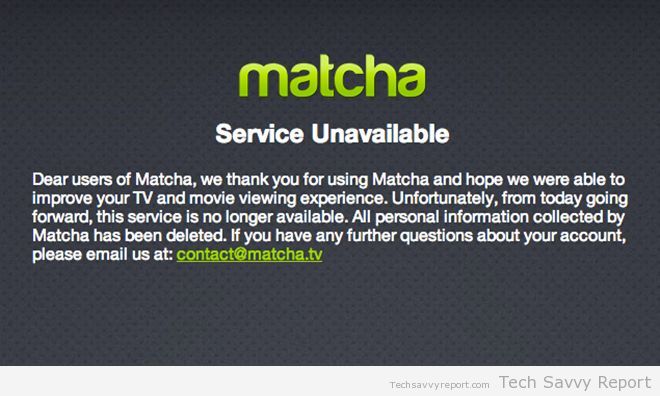Dear users of Matcha, we thank you for using Matcha and hope we were able to improve your TV and movie viewing experience. Unfortunately, from today going forward, this service is no longer available. All personal information collected by Matcha has been deleted. If you have any further questions about your account, please email us at: [email protected]
