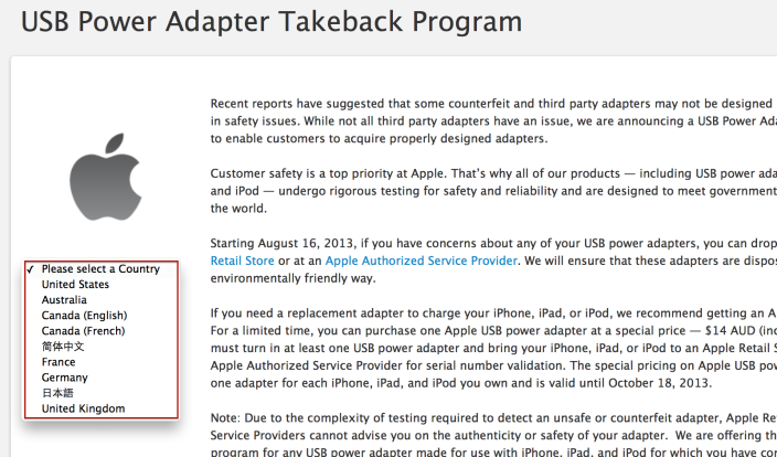Apple is wasting no time in getting to its customers in as many different countries as possible. Early this month, the Cupertino giant launched its charger take-back program that would allow its customers to trade-in third-party chargers (knock-offs) and get the official chargers at a discounted price. From what we have heard, many customers are taking advantage of this offer, and now the company is expanding to the offer to other countries. The program originally started in China on August 9, and will be coming to customers in the United States on August 16.