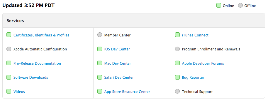 We sincerely appreciate your patience as we work to bring our developer program services back online, and we want to give you an update on our progress. The majority of our developer services are currently online, including Certificates, Identifiers & Profiles, Dev Centers, software downloads, Videos, Apple Developer Forums, iTunes Connect, Bug Reporter, App Store Resource Center, and access to pre-release documentation.