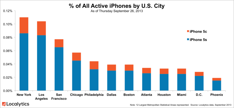 Lastly, Localytics looked at the biggest 12 cities in United States and found that the two smartphones made up the largest percentage of total iPhones in New York, Los Angeles and San Francisco. Most of the iPhones were on the big two, AT&T and Verizon, while the remaining were on Sprint and T-Mobile.