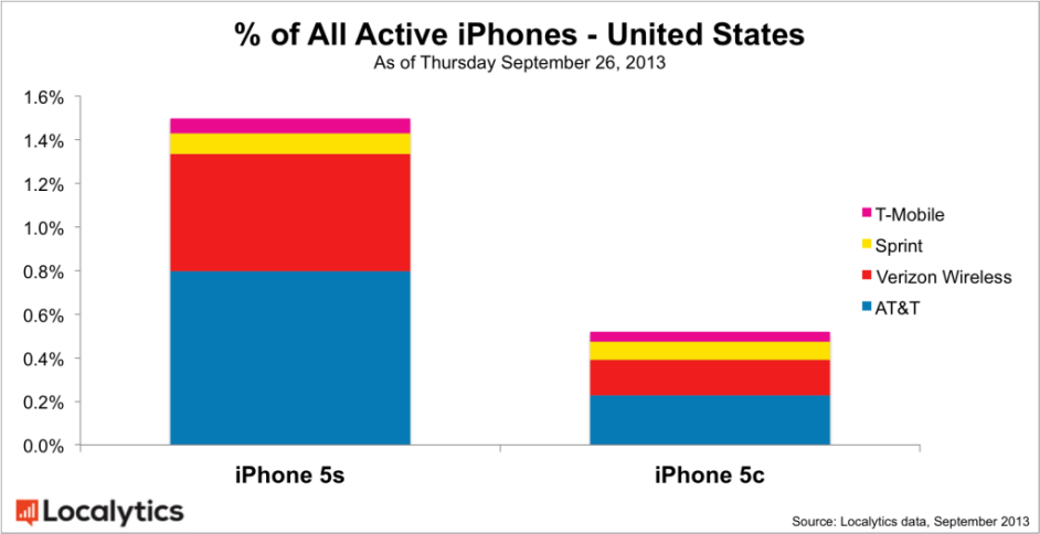According to a new report from Localytics, we may get a better of how sales were split. In the report, we see that the iPhone 5s is outselling the iPhone 5c by a huge margin. Data from Localytics is from more than 20 million unique iPhone handsets being used in the U.S. between September 20th and September 26th.