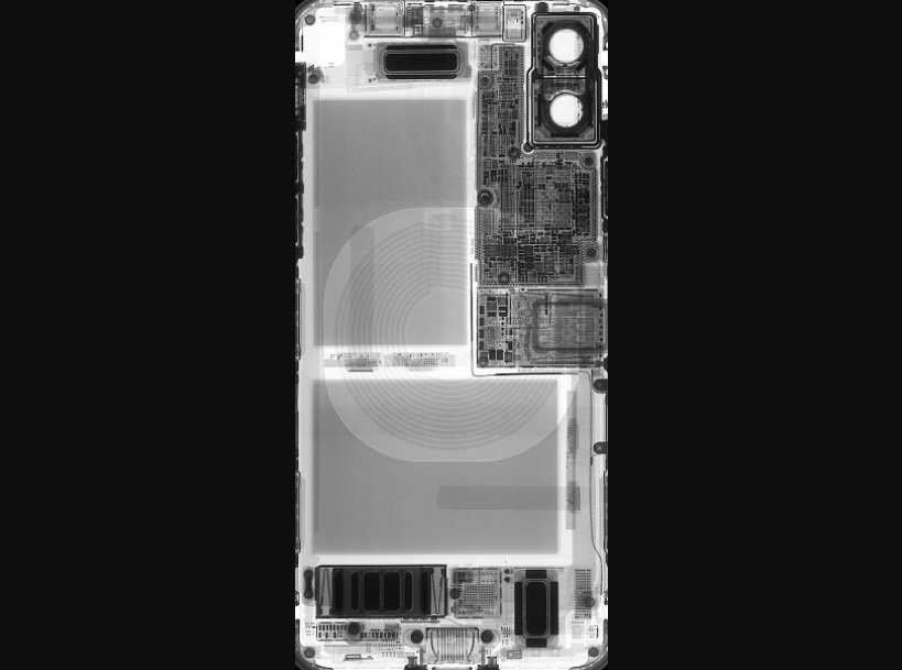 The standard wallpaper of the iPhone X shows the haptic engine, dual camera, and battery cells.
