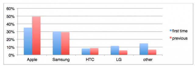 In a new report by AllThingsD, Apple is having a hard time attracting first time buyers. In a study done by Consumer Intelligence Research Partners, “Almost 50 percent of previous owners buy an iPhone, while under one-third of first-time owners buy an iPhone.”