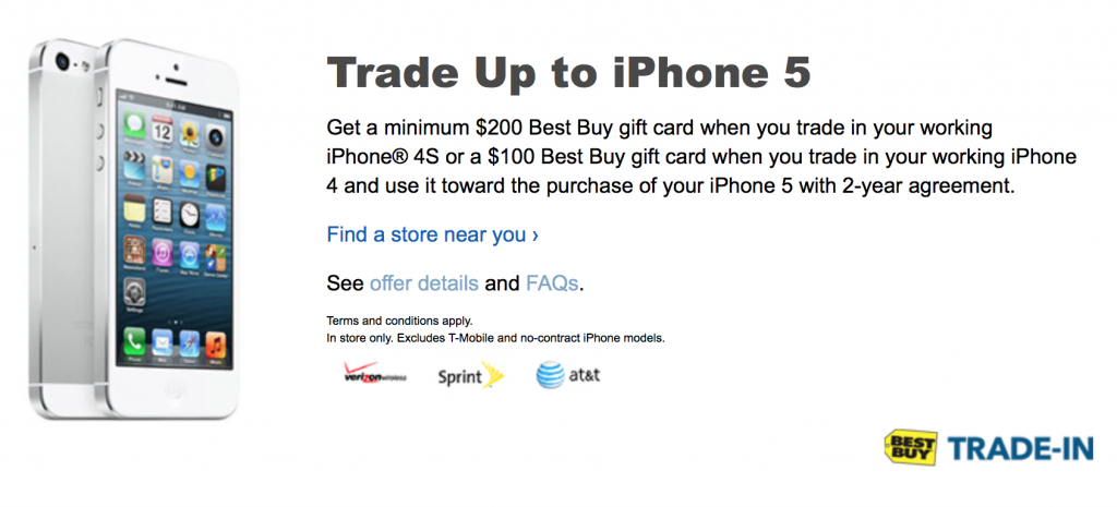 Best Buy is offering a minimum of $200 for your iPhone 4S and $100 for your iPhone 4 when you trade-in and purchase a new iPhone 5. Of course, as always, there is a catch. When you trade your device(s) in, you must pick an iPhone 5 with a 2-year contract with AT&T, Verizon Wireless or Sprint. You can get the 16GB entry level iPhone 5 for $0 if you get a minimum of $200 for your iPhone 4S.
