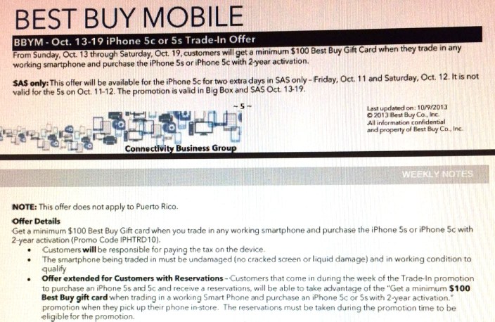A trusted source has provided us with a screenshot of an internal Best Buy document that states the retailer will be running a promotion from Oct. 13 to Oct. 19 that will allow you to trade-in select smartphones and receive a minimum of $100 in credit. The phones must be in working condition and be free of cracked screens or water damage to qualify.