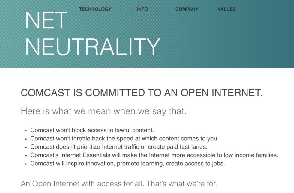 Take a look at this image of Comcast’s net neutrality promise from 2014 to April 26, 2017:
