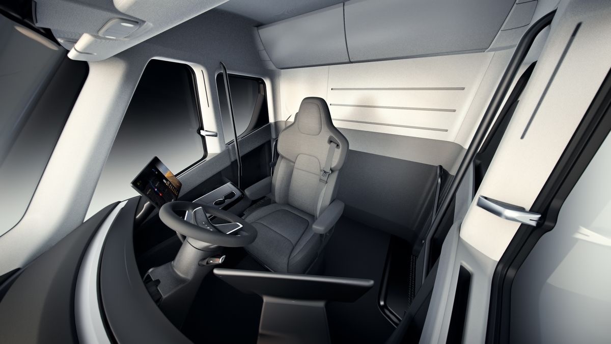 The design of the truck is absolutely gorgeous. The carbon fiber cab is all smooth lines, to say the least. Aerodynamics are a really big deal when it comes to fuel economy and Tesla has promised that the Semi will cut through the wind much more efficiently than some sports cars. Looking at the truck from the inside, the can borrows designs from its current line of offerings. The driver’s seat is now in the center. There’s also a jump seat behind it, to the right. Because the Semi truck doesn’t have a huge and bulky Diesel engine isn’t the front, Tesla converted the front nose of the cab into a vertical slab. The main seat is much more forward, so drivers will be able to see more of the ground in front than ever before.