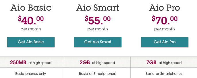 Aio Wireless launched with three plans, Aio Basic, Aio Smart, and Aio Pro. The company included $40/$55/$70 tiers pricing with unlimited talk/text and 250MB/2GB/7GB of data. Just a word of advice, the $55 and $70 plans seem the best bang for the buck to me.
