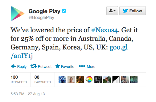 The already cheap Nexus 4 just got even cheaper. According to Google Play’s tweet, the Nexus 4 is now being discounted for an additional $100 off the current pricing. The Nexus 4 is already very cheap as it is, and now Google is looking to introduce a 25% discount to attract more customers to fall in love with the smartphone.