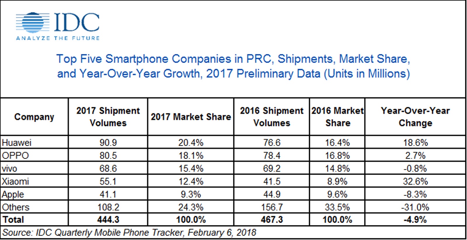Even though this is a drop, companies aren’t necessarily complaining. The drop is mainly applied to smaller phone brands, whose shipments plunged 31 percent. The top five companies (Oppo, Vivo, Huawei, Xiaomi and Apple) have seen their numbers dip very slightly or seen them go up. Huawei, the biggest of the lot, saw its shipments rise nearly 19 percent, thanks to range of phones that covers from lower end all the way to high-end hardware. Xiaomi saw its shipments jump an astounding 32.6 percent, despite experiencing troubles in the past. Vivo has shifted away from low-end models in 2017, and as for Apple, the company’s premium range has seen real success in “tier 1” cities like Shanghai and Beijing.