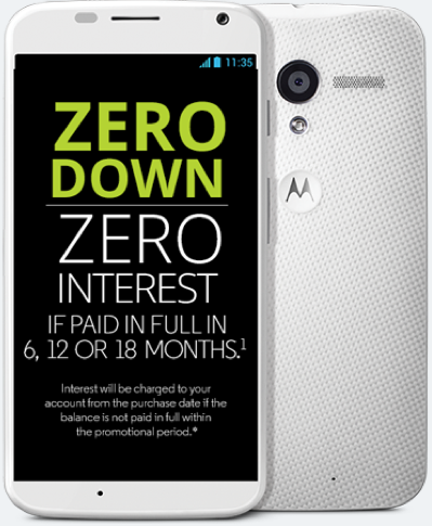 The key point to keep in mind is that you must, and I cannot stress this enough, must make the minimum monthly payment. For example, if you purchase the Moto X which is $549, it comes out to $30.50 monthly for 18 months max. If you wish to make a higher payment, that’s up to you, but making the minimum payment on your credit account is key to keeping your 0% interest. Otherwise, you may be subject to a very high interest rate.